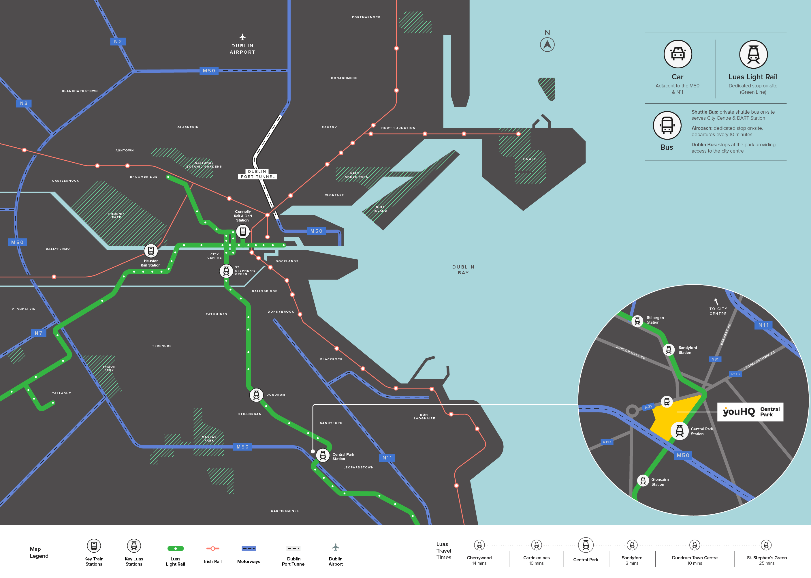 Central Park is extremely well connected. Adjacent to the M50 motorway, it also counts with a dedicated Luas Light Rail station and bus connections, and just a stone’s throw way from Dublin city centre.